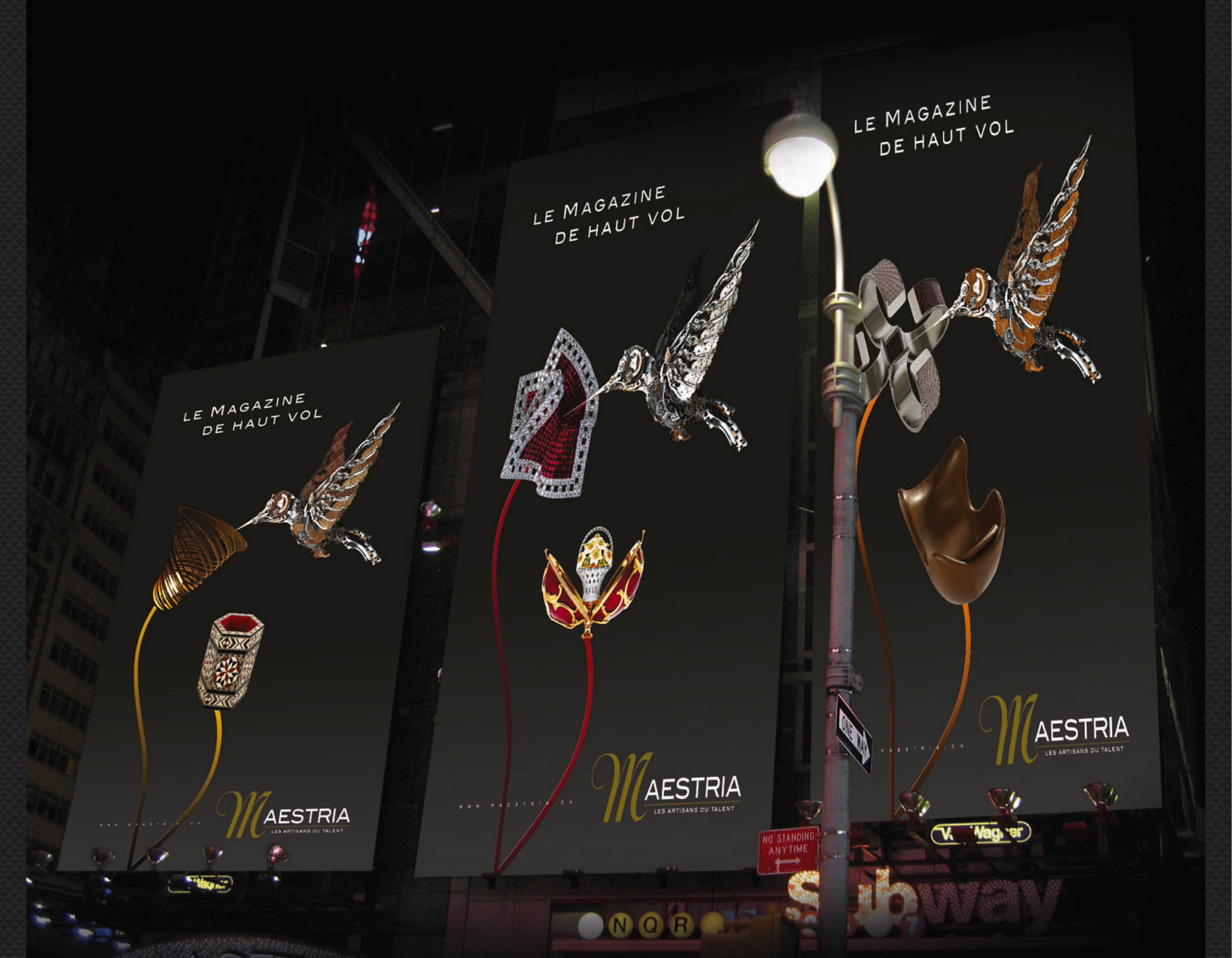 Concept d’étude : visuels publicitaires sous forme de teasing pour le lancement du magazine de luxe Maestria. Celui-ci met en exergue l’artisanat d’exception, toutes professions confondues, et s’adresse à tous les aficionados animés par une même passion, celle d’un artisanat de précision et d’excellence.